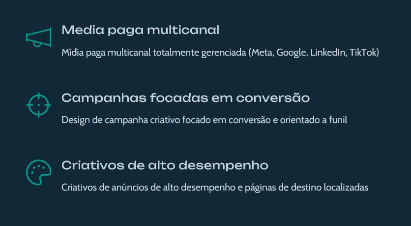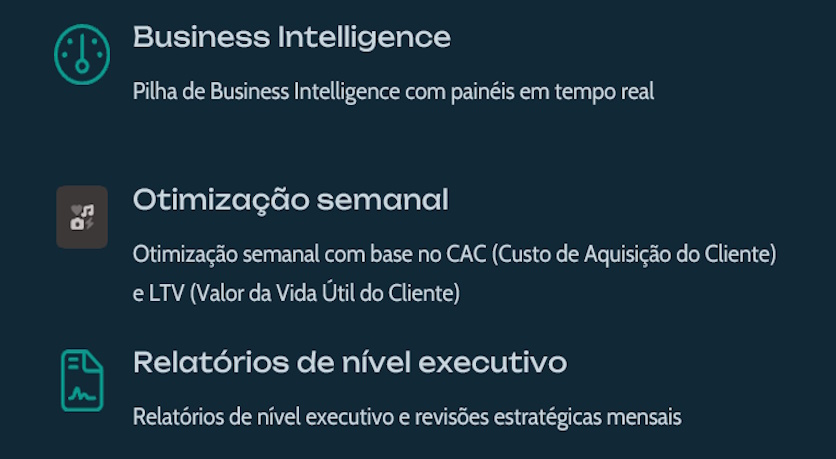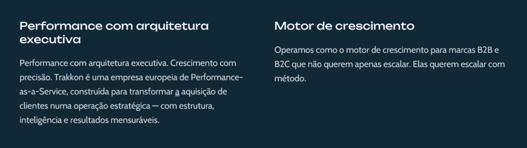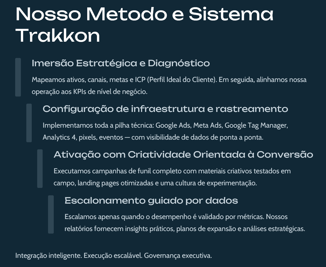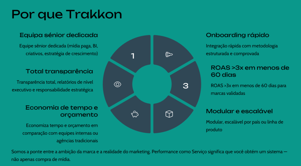 Clientes não compram mídia. Eles investem em crescimento. A Trakkon oferece uma equipe de crescimento completa que funciona como um sistema operacional de aquisição.